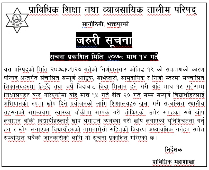 यस परिषद्को मिति २०७८।०९।२७ गतेको निर्णयानुसार कोभिड १९ को संक्रमणको कारण परिषद् अन्तर्गत संचालित सम्पूर्ण आङ्गिक, साझेदारी, सामुदायिक र निजी स्तरमा सञ्चालित शिक्षालयहरुमा हिउँदे तथा बर्षे बिदाबाट बिदा मिलान हुने गरी यहि माघ १५ गतेसम्म शिक्षालयहरु बन्द गरिएकोमा यहि माघ १५ गते देखि २० गते सम्म सम्पूर्ण बिद्यार्थीहरुलाई अभियानको रुपमा खोप दिने प्रयोजनको लागि शिक्षालयहरु खुला गरी सम्बन्धित स्थानीय तहसंगको समन्वयमा स्वास्थ्य चौकीमा सम्पर्क गरी तोकिएको उमेर समूहका सबै खोप लगाउन बाँकी बिद्यार्थीहरुलाई खोप लगाउने व्यवस्था गरी खोप लगाएको सुनिश्चितता गर्नु हुन र खोप लगाएका विद्यार्थीहरुको नामनामेसी सहितको विवरण अध्यावधिक गर्नुहुन समेत सम्बन्धित सबैको जानकारीको लागि यो सूचना प्रकाशित गरिएको छ ।