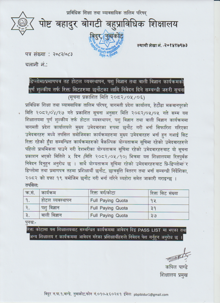 डिप्लोमा/प्रमाणपत्र तह होटल व्यवस्थापन, पशु विज्ञान तथा वाली विज्ञान कार्यक्रमको पूर्ण शुल्कीय तर्फ रिक्त सिटहरुमा छनौटका लागि निवेदन दिने सम्बन्धी जरुरी सूचना By admin|2025-08-22T15:12:24+05:452025-08-22|Uncategorized|0 Comments Share This Story, Choose Your Platform! FacebookTwitterRedditLinkedInWhatsAppTelegramTumblrPinterestVkXingEmail